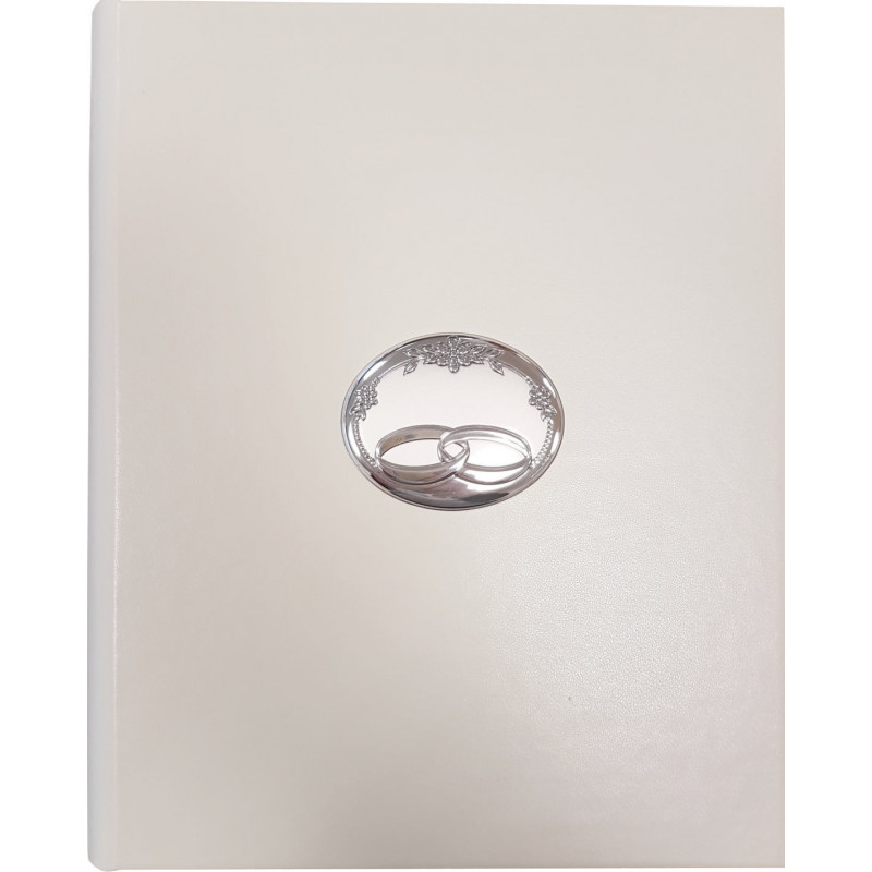 Zaujímavý svadobný fotoalbum v bielom prevedení so strieborným obrázkom.
